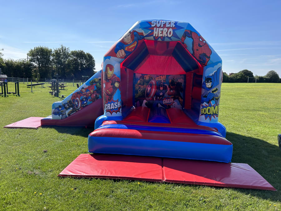 Looking for superhero party ideas then look no further we have built this package to suit all heroes. included in this package is our full themed slide bouncy castle featuring all the favourite characters along side a matching carnival game and 3D bat mobile .