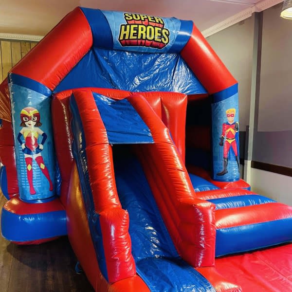 A firm favourite with so many children is super hero themed bouncy castles , this bouncy castle has all the children's favourite heros such as batman , spiderman , captain america , the hulk and good old superman . featuring a bounce area but with the added extra of a slide coming out from the front this inflatable really does tick all the boxes for all up and coming mini super heros . Inflate-A-Bubbles also have many other super hero products such as disco castles ,