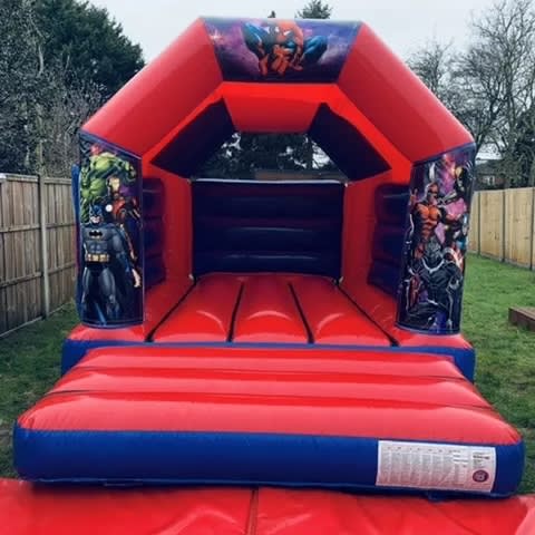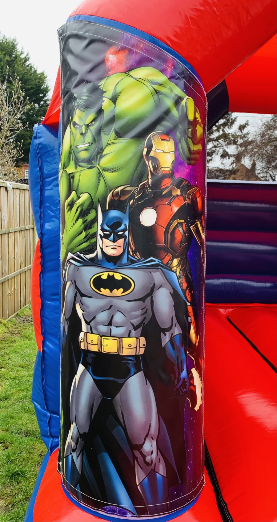 A firm favourite with so many children is super hero themed bouncy castles , this bouncy castle has all the children's favourite heros . Inflate-A-Bubbles also have many other super hero products such as a slide combo disco castles , large hero fun runs and even a super hero photo backdrop to capture your super heros special day all of these products can be found on our super hero page