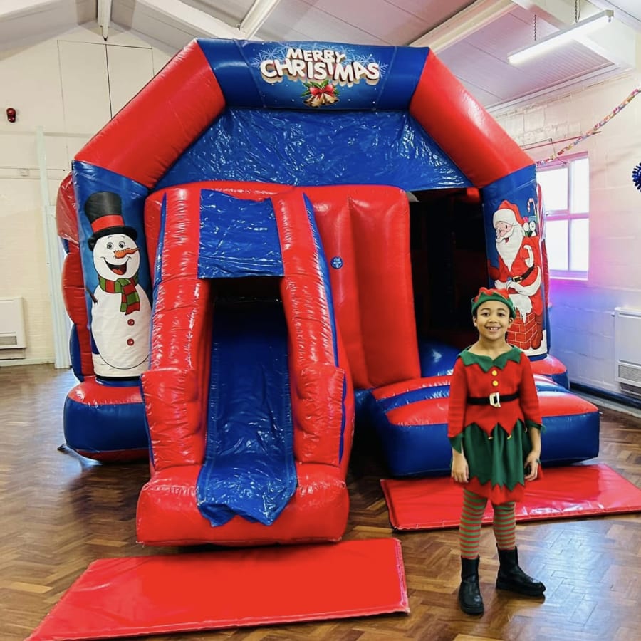 Here at www.inflatate-a-bubbles.co.uk we have added something extra special to our comprehensive fleet of current and up to date bouncy castles , Our brand new and totally unique to Kings Lynn and all surrounding areas is the amazing Christmas front slide Bouncy castle . Featuring stunning artwork of a loveable winter snowman and also the main man himself Father Christmas , this is on a stunning high gloss material for the ultimate finish that will really stand out at any Christmas party or event . This Christmas slide bouncy castle has a built in rain / sun cover so even the weather won't spoil your event . Our vans not only deliver in Kings Lynn but most of the surrounding towns and villages just CLICK HERE to check we cover your area , Bookings can be made 24 hours a day using our online diary and booking system simply select your item then choose your date then if it's available just click on book now and our system will take all your details it really is that easy and stress free to book your bouncy castle hire with us in Kings Lynn and all surrounding areas . Many questions you may have can be answered by going on our FAQs page alteratively just CLICK HERE to email our office or call one of the team on 07411910448 and we will be only to happy to help . Don't forget we also have a wide range of hire items for all ages from soft play for the younger guests to large slides , assault courses and even disco domes . If you are looking at booking more than one hire item then check out our packages page for many great money saving ideas and party extras can be added to any bouncy castle hire as well .