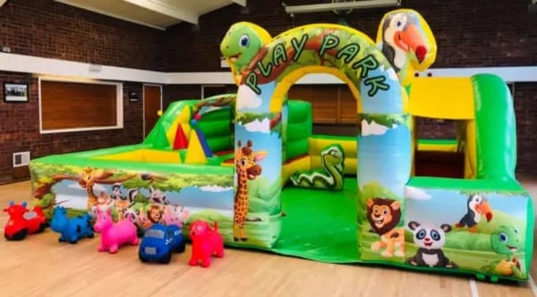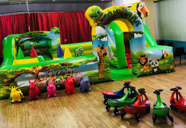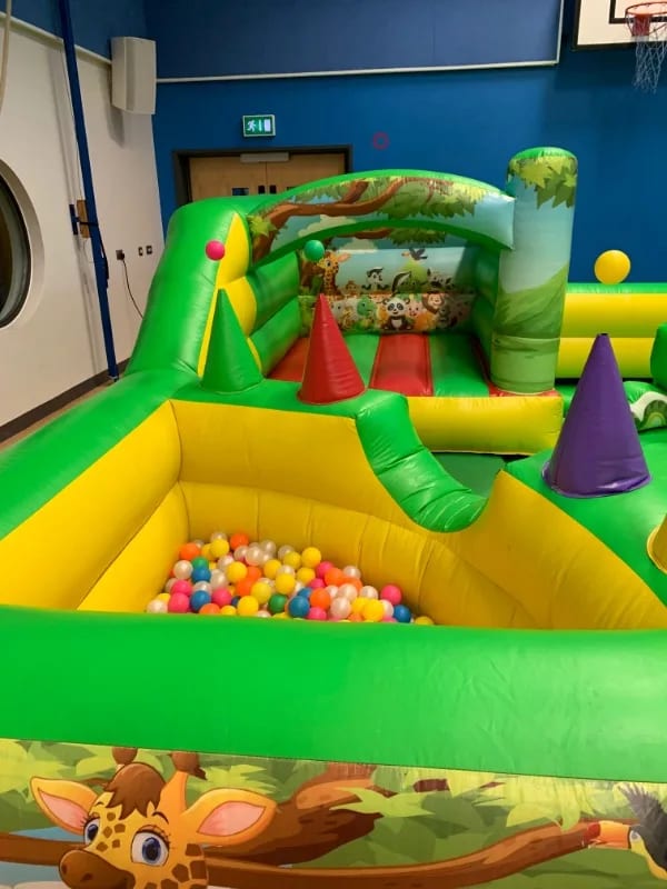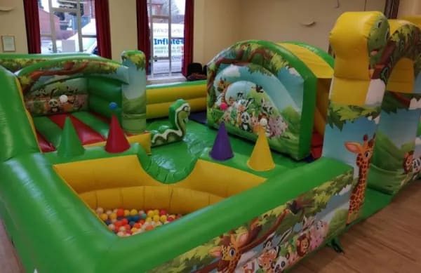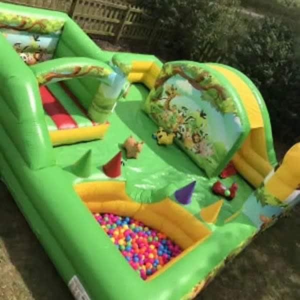 This inflatable is designed specifically for the toddler age group featuring a small bouncy castle and built in ball pool with balls supplied all with the added safety aspect of an inflatable surround so your little ones can be left to play in a totally safe environment , there is also a large enough area for the little ones to crawl around or you could even add and extra item inside such as animal hoppers or a soft play set just for something different , the play park is finished in an animal theme for all your little monkeys to enjoy . Inflatate-A-Bubbles can also supply themed back drops for fantastic photo opportunities of your little ones special day please see our party extras page and you can even down load our FREE PARTY INVITES to send to your guests . We have been in the entertainments industry for over 10 years so do feel free to contact us via email or call one of the team on 07411910448 and we would be only to happy to help , bookings can be made online using our online diary and booking system 24 hr a day 7 days a week , ensuring our clients get the very best service at the best price they can then why not have a look at our packages page for some fantastic money saving deals .