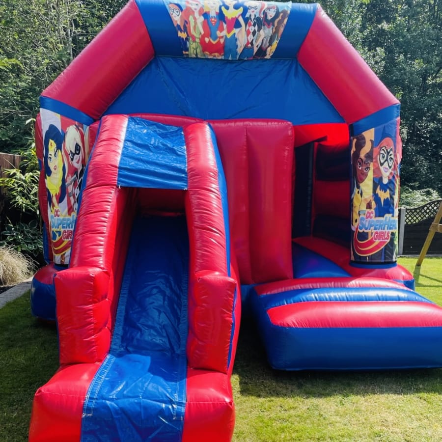 Our brand new DC girls Superhero front slide castle that's right superheroes are not just for the boys and comes in a high vibrant gloss material with stunning high quality art work. This castle is perfect for smaller gardens and halls and a mixed age group of children. If you have some little superheroes attending your special day then take a look at our