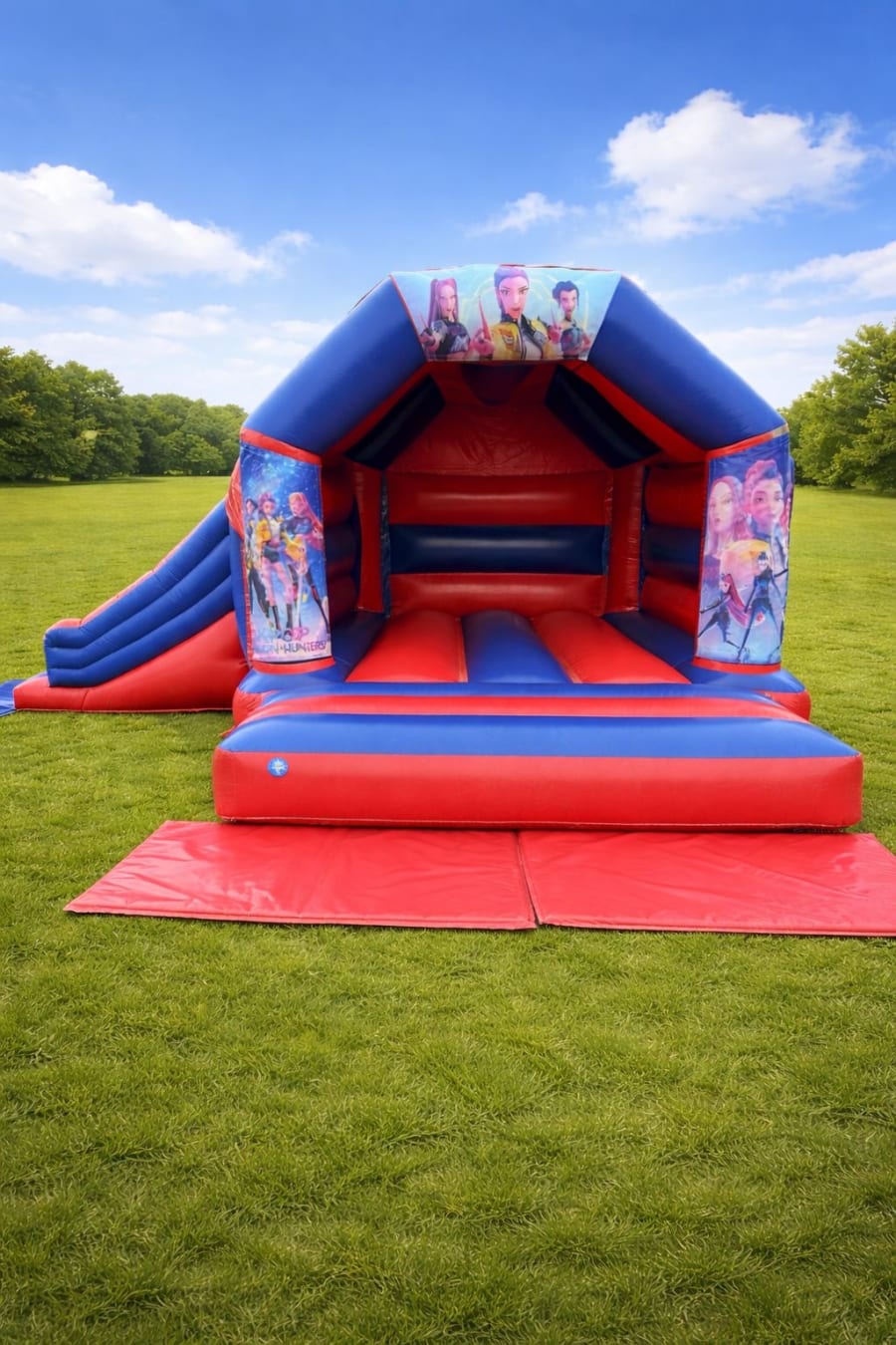 K Pop Demon Hunters bouncy castle red and blue side slide