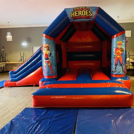 A firm favourite with so many children is super hero themed bouncy castles . Featuring a bounce area but with the added extra of the slide coming out from the side this inflatable really does tick all the boxes for all up and coming super heros . Inflate-A-Bubbles also have many other super hero products such as disco castles ,