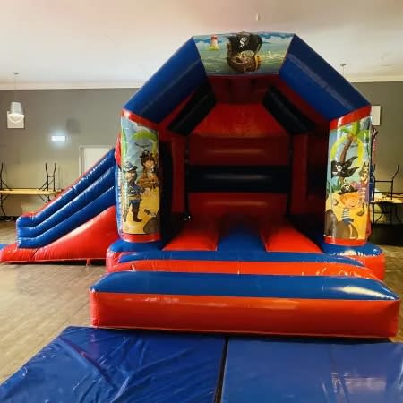Ahoy there shipmates jump aboard with your crew and enjoy the bumpy waves. Our Pirate bouncy castle is one of our most popular themes comes with vibrant glossy artwork and a built in sun and rain canopy and a slide on the side.