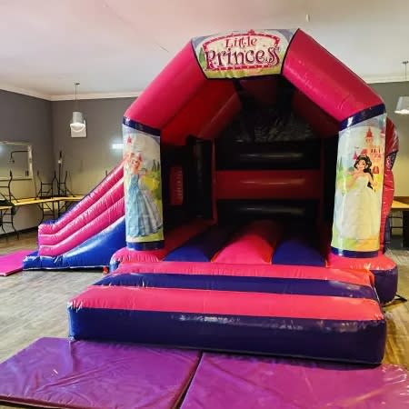 looking for princess party ideas in Kings Lynn then look no further this stunning fantasy princess bouncy castle is in pink and purple high gloss with vibrant princess art work with the added extra of a slide coming of the side also including a sun and shower cover . Wanting more than just a