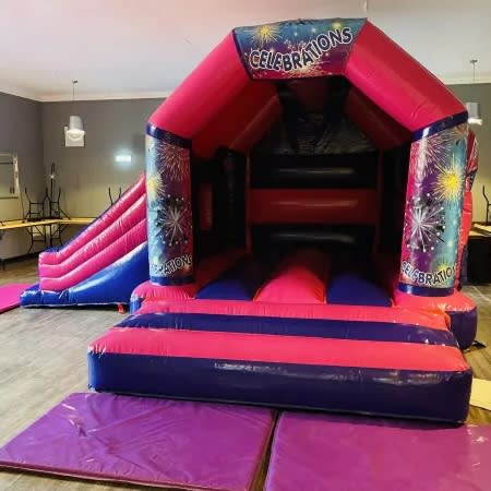 Lets celebrate in style with our classic celebrations side slide castle perfect for all occasions from a good old fashioned garden party to your little ones special day. This bright coloured castle is designed with a built in rain and sun cover for extra protection come rain or shine. Being a 12x16 it fits in most gardens and halls but if you are looking for something for all of your guests take a look at our garden games and party extras they are great fun for all ages keeping everyone entertained .We also hire our amazing hot dog machines very easy to use we set them up giving you more time enjoying your special occasion keeping you out of the kitchen and making memories. If requiring any assistance with building the perfect party package click here to email our office or call 07411910448 where one of the team will be more than happy to help. We cover Kings Lynn, Sutton Bridge, Swaffam, Wisbech, Hunstanton, and surrounding areas.