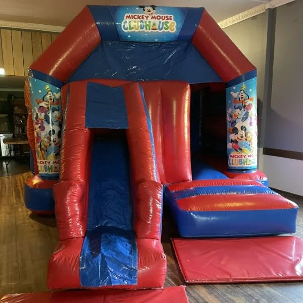 Looking for Mickey Mouse Clubhouse party ideas then look no further we have a variety of Mickey and Minnie bouncy castles available. This inflatable comes in red and blue gloss material with bright vibrant artwork featuring Mickey Minnie and the gang with the added extra of a slide on the front making it more versatile for the more narrow halls and gardens also has a built in sun and shower canopy. Want to make your little ones day more special then take a look at our games and party extras we also have a great money saving packages category. Inflate-A-Bubbles have been in the entertainments industry for over 10 years and our team are only to happy to give you any help or advice making your booking just CLICK HERE to contact our office via email or call one of the events team on 07441910448 and we would be only to happy to help make your party or event one to remember. Bookings can be made online 24 hours a day 7 days a week using our online diary and booking system it really is that easy and stress free when choosing Inflate-A-Bubbles , your No1 choice for inflatable hire in Kings Lynn and Wisbech, Downham Market, Marham, Denver, Swaffam, Tilney, Terrington, Barton Bendish, Wereham, Sutton Bridge, Clenchwarton and all surrounding areas. Cant find your area take a look on our areas covered . We even have FREE PARTY INVITES you can choose and download .