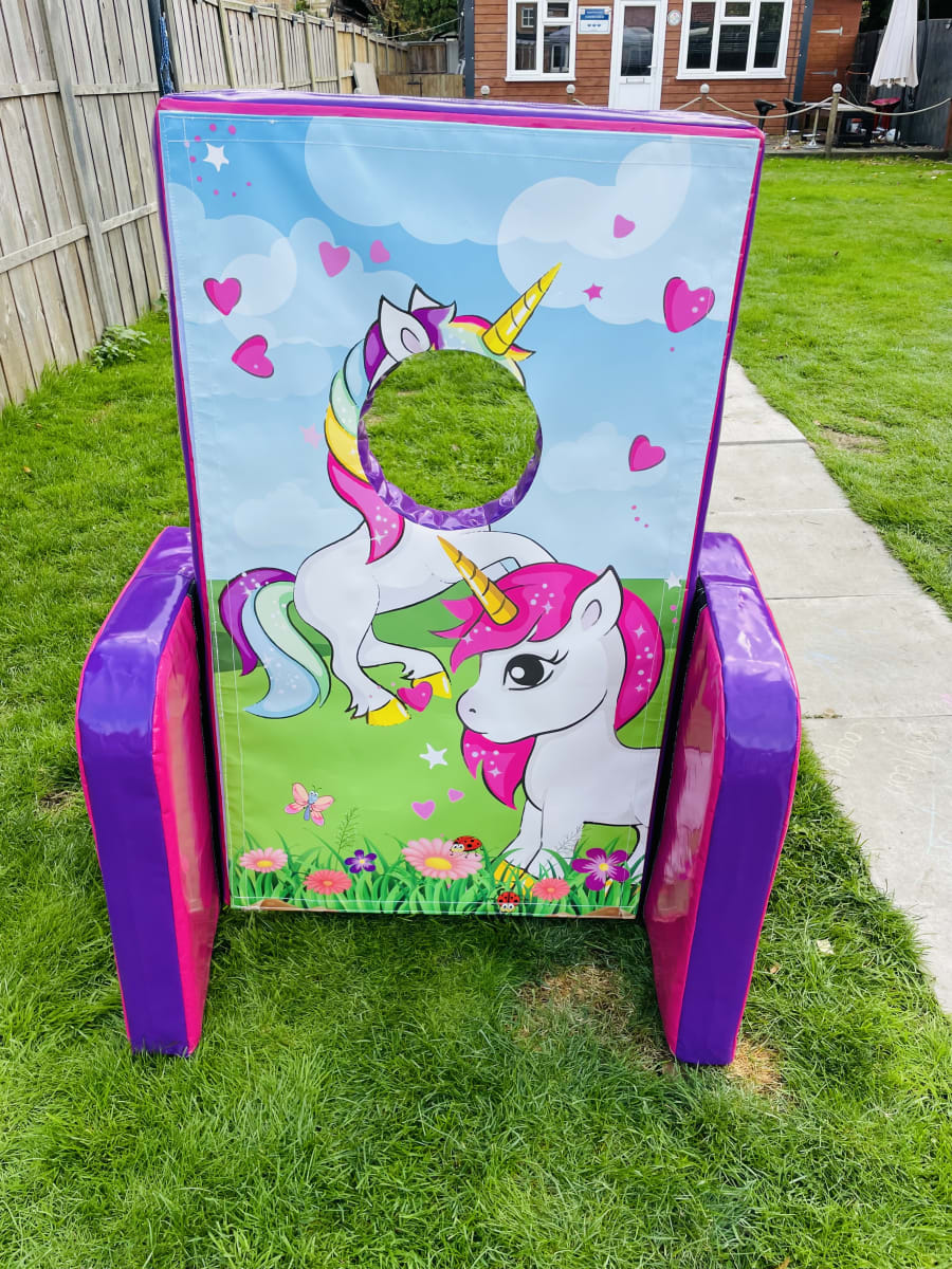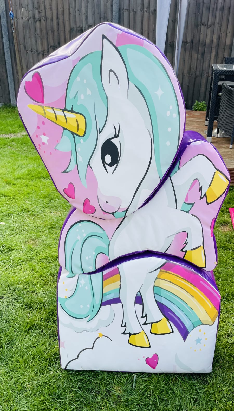 This lovely eye catching 24 piece luxury unicorn theme set of soft play has it all from unicorn shapes,peep board perfect to catch your little ones pictures , rockers, stepping stones, building blocks, an impressive 3ft puzzle shape included in with the soft play ball pool and 500 balls included. Wanting more ? then take a look at our matching gloss unicorn bouncy castle and unicorn photo back drop to capture all your memories of your little ones special day. We also do adult bouncy castles and garden games so the whole family can join in the fun. We cover Kings Lynn and surrounding areas click here to contact our office via email or call on 07411910448 and a member of our team will be happy to help with any enquiries.