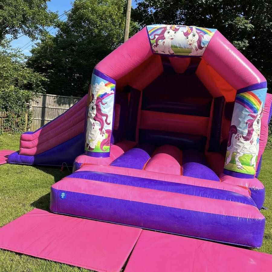 Perfect bouncy castle for Unicorn fans and the added extra of slide coming off the side .This inflatable comes in pink and purple high gloss with vibrant magical unicorn artwork with a sun or showers canopy on. Wanting to add more to your party we have matching unicorn soft play,