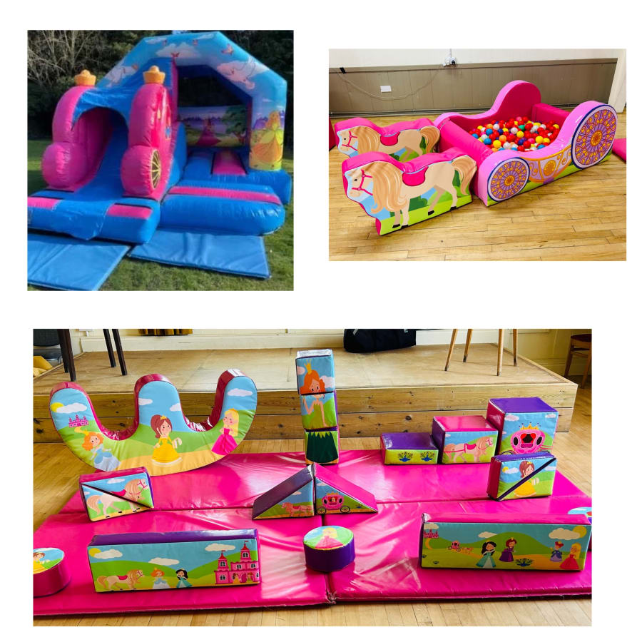 Looking for princess party ideas in Kings Lynn then you are at the right place we have a large range of princess themed items available for hire. This princess package includes a top of the range 3D princess carriage slide bouncy castle with a matching soft play carriage and horses ball pool also matching Princess soft play and rocker making sure your very own princess has an amazing fun filled party.