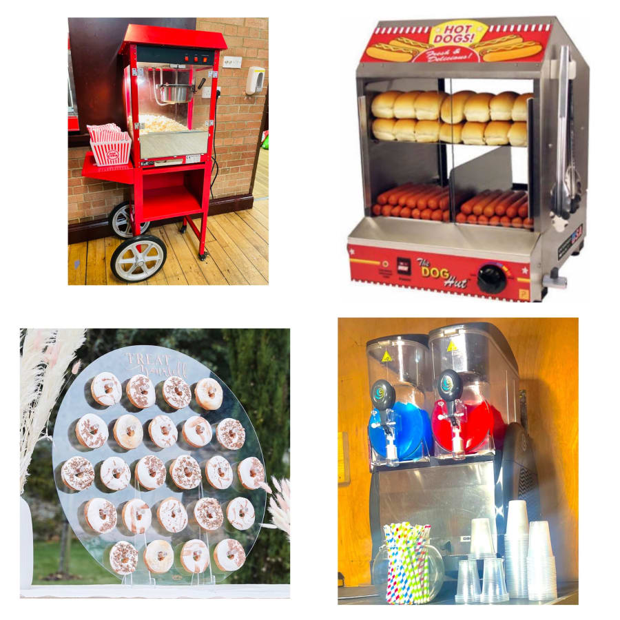 Looking to hire fun foods tin Kings Lynn hen take a look at this fun food package. This package contains our Hot dog steamer, Slush machine cups and straws and slush for a 100 party guests, Popcorn steamer with 35 portions of warm popcorn and Donut wall . all included in the price.