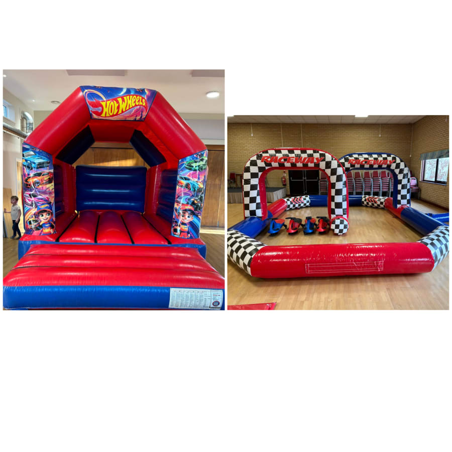 Looking for hot wheels party ideas then our hot wheels racing car package for hire in kings lynn is a great fun filled package not only does it have a hot wheels bouncy castle but also your very own race track with 4 wiggle cars so your party guests can be real life hot wheels racers for the day.