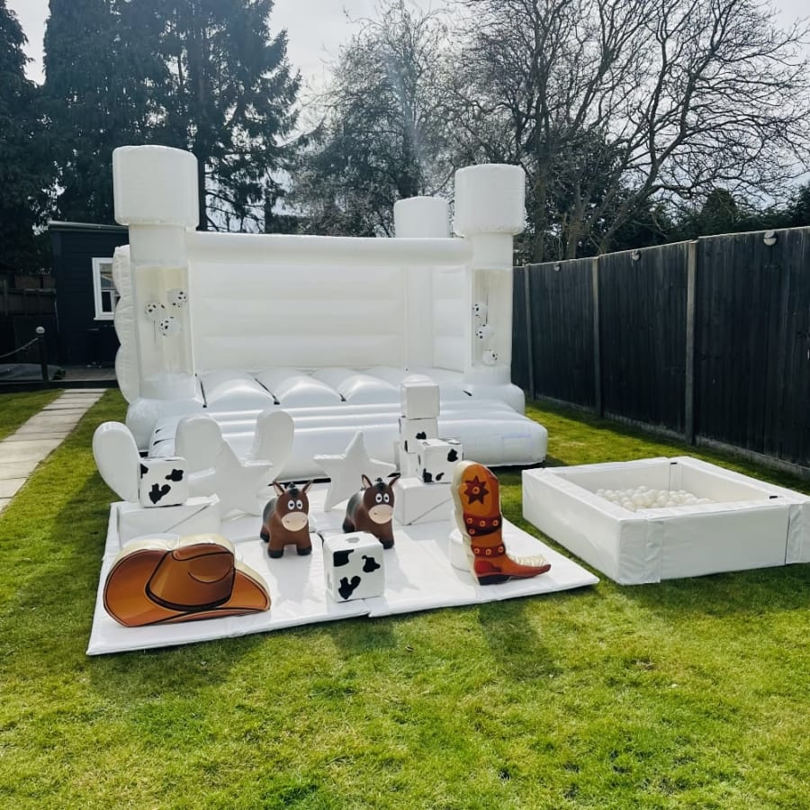 Looking for My first Rodeo party ideas in kings lynn, Wisbech and surrounding areas then look no further as this stunning rodeo package comes with 20 piece soft play and ball pool with the added extra of the cowboy hat and boot with the cow patch blocks to match your rodeo theme. Also in this package is a stunning high gloss white bouncy castle with clear viewing windows that you can add balloons of your choice into.