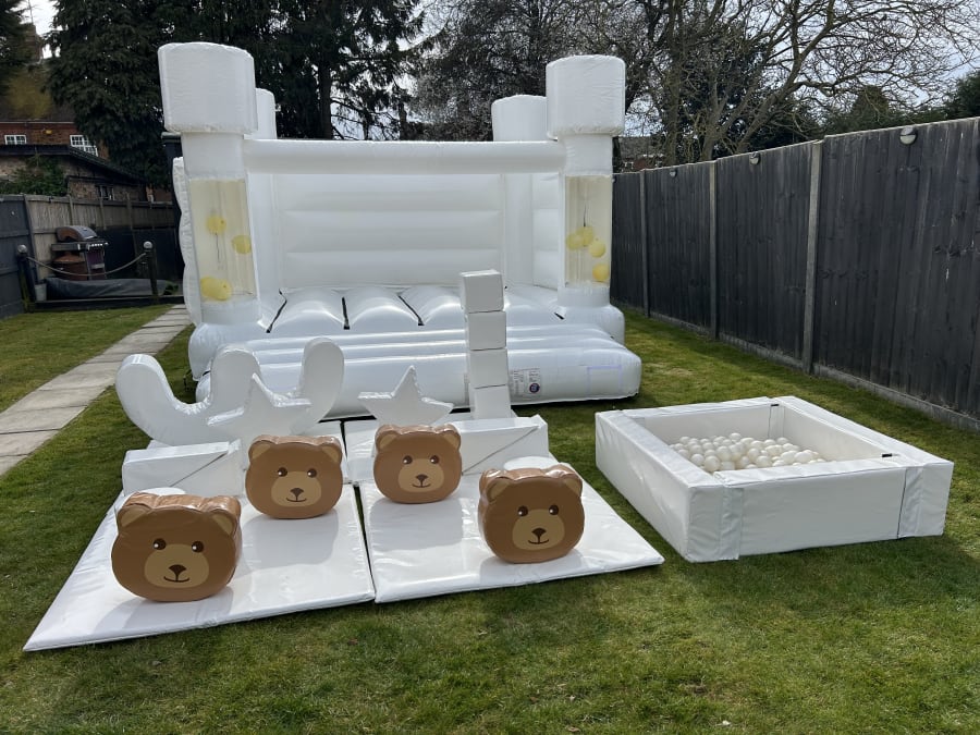 Looking for Teddy party ideas in Kings Lynn and surrounding areas then our stunning white teddy bear package has it all from a full 20 piece soft play set and ball pool with teddy bear shapes to match your theme along side our beautiful white bouncy castle . No expense has been spared with this bouncy castle in high vibrant gloss material this is unlike your normal inflatable it comes with clear viewing windows so you can add any balloons of your choice to the windows making your little ones day extra special with this added feature