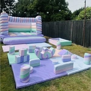 Our stunning Pastel Flump package was custom made with one of our favourite retro sweets in mind. No expense has been spared with this design being made in top quality high gloss material in matching pastel colours to match the aesthetic for each item . Included in this set is a twist bouncy castle alongside a 18 piece matching soft play set and ball pool .