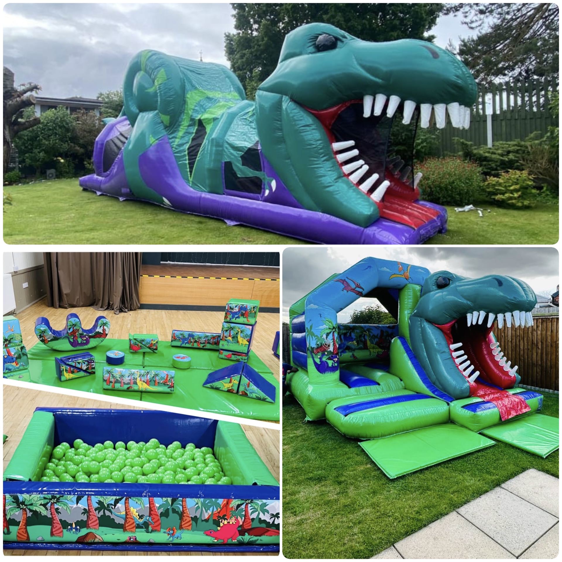 Calling all Dinosaur fans take a look at our awesome range of Dinosaur products we not only have dino bouncy castles we have a mega 3D dino assault course in a matching T-rex theme to our bouncy castles and if thats not awesome enough we have the matching soft play and air juggling ball pool in our ultimate Dino package .If your little one is not a T-rex fan we also have a 3D Triceratops slide bouncy castle and Dinosaur carnival games.